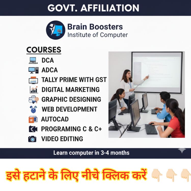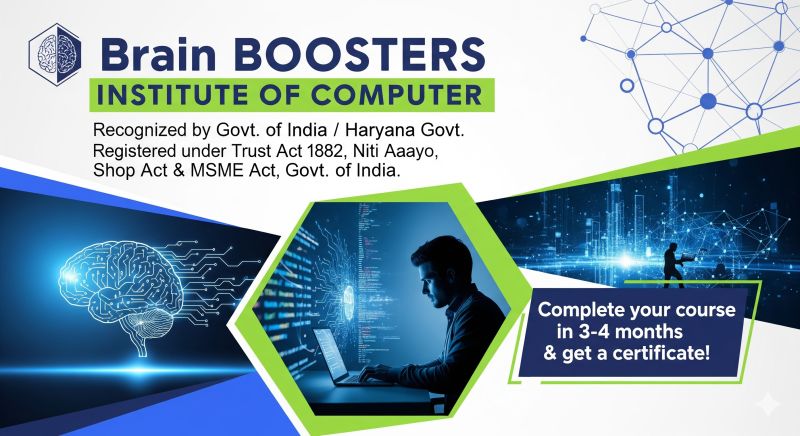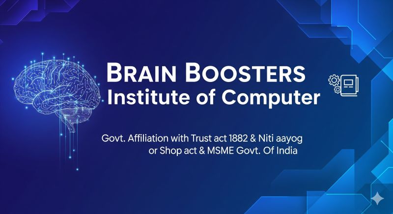 Brain Boosters Institute Of Computer (BBIC) Registered under the Public Trust Act-1882 & Delhi NCT, Niti Aayog & Shop Act of Labour Department . and Ministry of MSME Govt. Of India . to conduct full/short term courses for the students in these far flung, rural & district areas of the country. It is only to make Information Technology as a basic knowledge to people of Rural & Urban area. Working in different fields of Programme & Commercial training conducted by the State Government & Central Government to approach every class of the society.