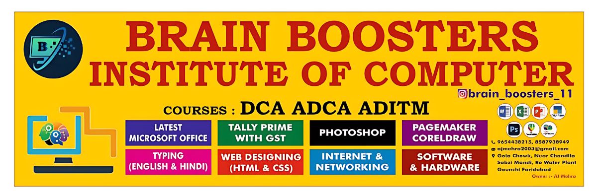 Brain boosters institute of computer This is the best institute in Faridabad for basic and advanced computer course. This institute is govt. approved and this is also a good thing. I have done my DCA course from this institute. It is very good.